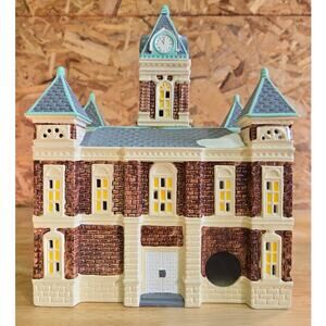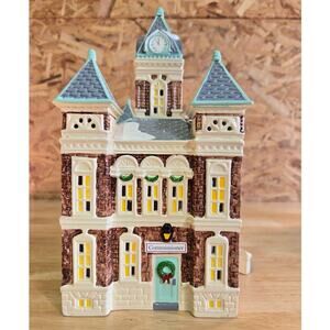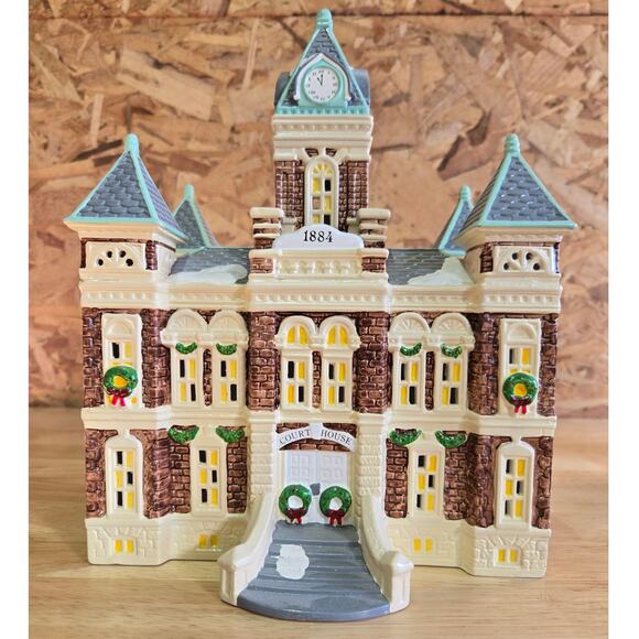 Add a touch of vintage charm to your holiday village with this Department 56 Original Snow Village County Courthouse. This piece, number 5144-6, comes complete with its original box, making it a must-have for collectors and holiday enthusiasts alike. It's in great shape and ready to be displayed and enjoyed for years to come. Don't miss out on the opportunity to own a piece of holiday history! The dimensions are 9 x 7.75 x 6.25 inches. Manufactured 1989.