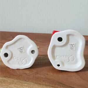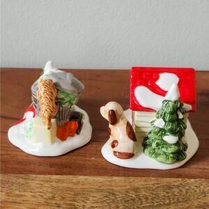 Both figurines are ceramic, hand-painted, glossy, and feature delightful Christmas details like festive trees, snow drifts, and tiny accents.