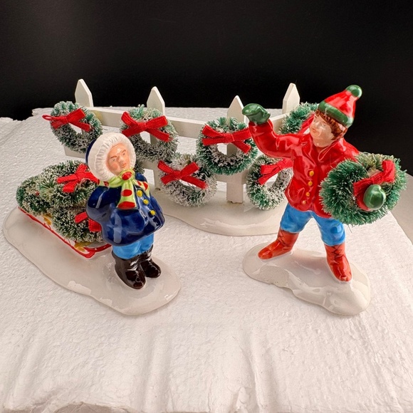 Department 56 Snow Village Wreaths for Sale - 4 pieces - a fence with wreaths displayed, a boy selling wreaths, girl pulling a sled with wreaths, and a bag of extra wreaths - are ceramic and porcelain collectibles designed for Christmas decor. Part of the Snow Village collection by Department 56, these pieces add a festive touch to your holiday display with their charming design. The set includes four intricately detailed pieces that are perfect for showcasing on your mantel, doorstep, or tabletop during the Christmas season.