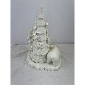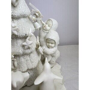 Department 56 Snowbabies Lift Me Higher I Can't Reach 6863-2 with Ornaments is a medium-sized figurine from the Christmas collection. Made of porcelain, pewter, and ceramic, it features a white tree subject. This modern Snowbabies piece was manufactured in 1995 in China and is part of a retired series. It is a handcrafted, original figurine with a matte finish, perfect for collectors of late 20th-century holiday decor.