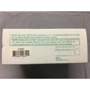 Department 56 "Frosty Light Sprays" set of 2, lights up. Battery operated,AC/DC adapter compatible (2 C Batteries required) Made in China. #52682. Battery Pack: 2 3/4"x 2 1/2"x 1 1/4" Light Sprays: 2"x 2"x 1 1/2" Box: 4 1/2"x 6 1/2"x 2 3/4", 3 oz.