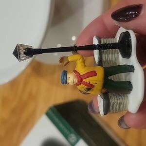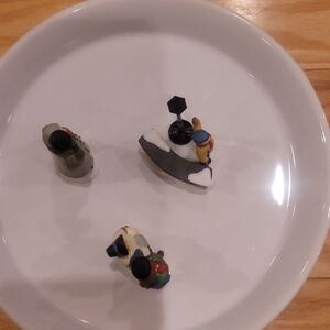 Charming miniature winter figurines featuring a couple, a child, and a lamp post. Perfect for holiday decor. Department 56 Dickens Village