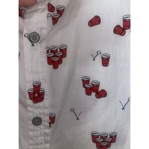 Classic cut. Button front. White with red solo cups showing various beer pong scenes.
