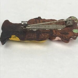 Description: Great Depression Era 1938 Walt Disney wooden pin brooch pinback of Dopey from the Seven Dwarfs holding a candle and yawning