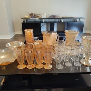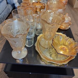 Elegant vintage glassware set featuring amber and clear pieces. Perfect for collectors or entertaining.