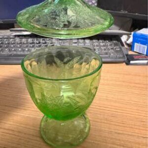 RARE Footed Candy Dish & Lid, Floral Green. There is uranium in it due to the glowing under a UV black light!