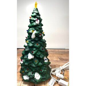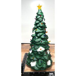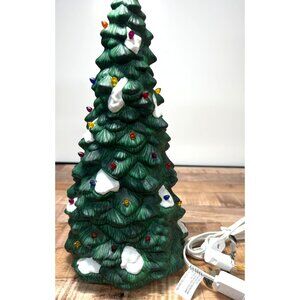 A meticulously crafted ceramic Christmas tree from the Heritage Village Collection, featuring intricate detailing with multicolored lights and a golden star topper. Designed as a decorative piece for holiday enthusiasts and collectors seeking elegant seasonal home accents. Tree and light only. 1 plastic bulb is missing