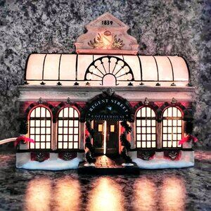 tags: Department 56, Dickens Village, Regent Street Coffeehouse, Christmas village, lighted building, porcelain collectible, vintage holiday decor, retired piece, 2002 edition, Victorian Christmas, festive miniature, snow-covered roof, hand-painted, illuminated house, holiday display, mantel decor, Christmas collectible, nostalgic Christmas, winter village, rare find, original box included, giftable, cozy coffeehouse, holiday charm, classic architecture, wreath accents, garland details, red bow decor, collectible series, tabletop