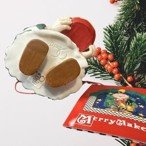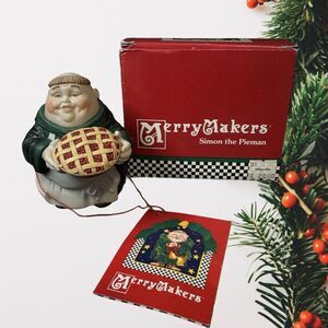 Vintage Dept 56 Merry Makers figurine featuring Simon The Pieman, a monk friar, from the 1990s. Made of porcelain and ceramic, this collectible piece captures the Christmas spirit in its design. Manufactured in Taiwan during the 1990s, it comes in its original box. The figurine is a unique addition to any holiday or seasonal collection.