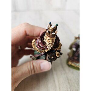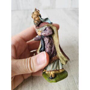 crouching down Wiseman is about 3.5 in tall by 2 in by 1.5 in, is actually in good condition, one with missing arm is about 4.5 in tall by 1 in by 1.5 in, does have a couple chips on his cape otherwise, men with the crown is about 4-in tall by 1.5x1 inch, does have damage on the crown and chips on the cloak, sold as a set together