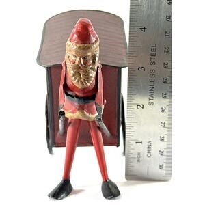 Delightful Dept 56 Christmas figurine featuring Santa Claus pushing a red “Santa’s Mail” cart. Crafted from painted metal with a nostalgic folk-art look, this piece captures the whimsical charm of vintage holiday decor.