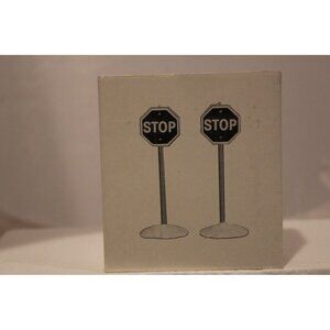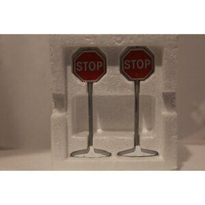 Enhance your holiday display with this set of 2 Dept 56 Snow Village stop signs, perfect for adding a touch of realism and charm. Ideal for collectors and holiday enthusiasts.