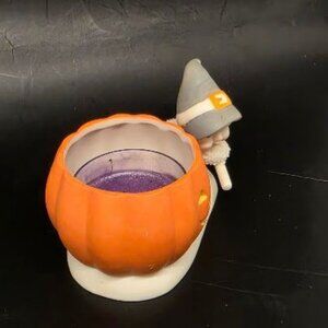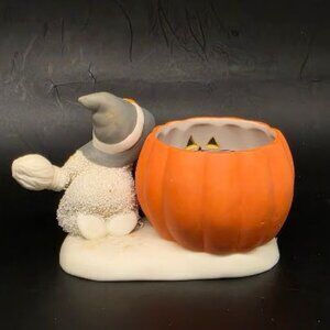 This vintage Snowbabies candle holder by Department 56 showcases a charming Halloween theme. Featuring a pumpkin design, it adds nostalgic warmth to seasonal decor.