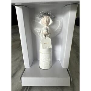 This is a Department 56 Whispers XOXO Angel figurine produced by Enesco in 2010. The figurine features an angel with a theme of love and holidays, suitable for all occasions. It comes in its original box, making it ideal for collectors. The angel figurine would make a charming addition to any room as a decorative piece and a reminder of love and positivity.