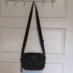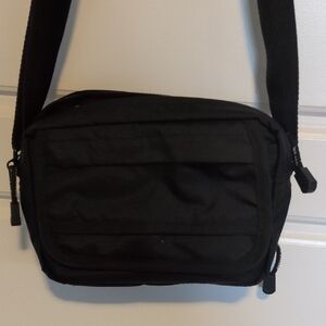 Sleek and versatile, this bag is perfect for everyday use with adjustable strap. The classic black color complements any outfit, making it a must-have accessory. It is lightly used and has a little red powder on the bottom in one compartment. Lots of pockets. I paid $35 for this.