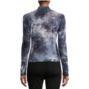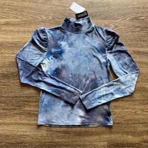 Long sleeve blue tie-dye mock neck top, puff sleeve top