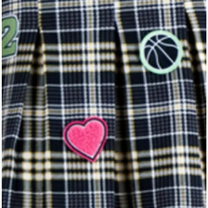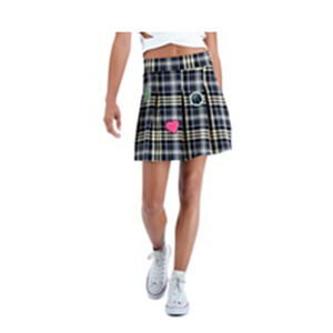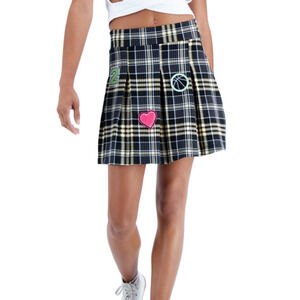 Derek Heart helps you hit the hallways in style in this pleated plaid skirt designed with patches placed throughout.