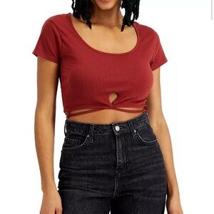 Stylish crop top with short sleeves. Features a scoop neckline and tie detail. Perfect for casual wear.