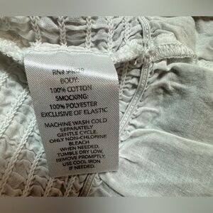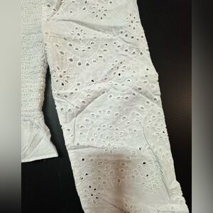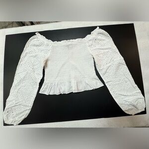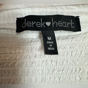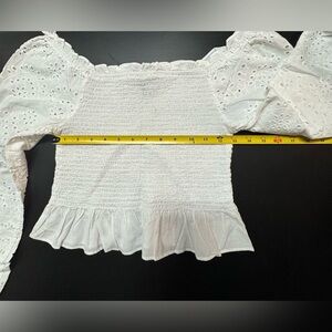 Derek Heart likely a blouse, SMOCKING in size Medium of shoulders Elegant white blouse with eyelet details. Features a flattering peplum and long sleeves.