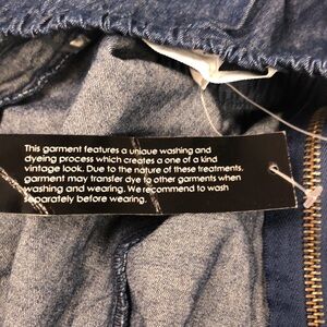 Denim romper has a zip front with pockets. Elastic waistband with sweetheart neckline. NWT!
