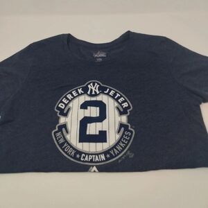 This product is a Majestic Derek Jeter Youth Large T-shirt featuring the legendary baseball player from the New York Yankees. This official MLB apparel is perfect for young fans looking to show their support for their favorite player and team. Made for baseball enthusiasts, this shirt is a must-have for any young fan wanting to represent their favorite player on and off the field.