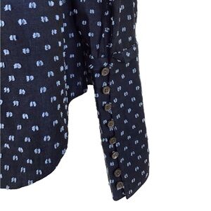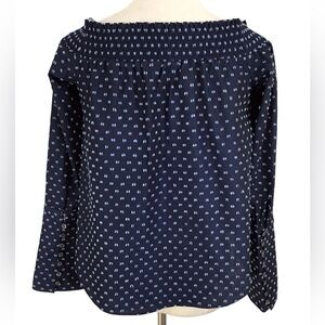 This beautiful Derek Lam 10 Crosby top is perfect for any occasion. The off-the-shoulder neckline and smocked features add a touch of bohemian style, while the pullover closure and long sleeves make it a versatile piece for travel, party, or casual wear. The blouse is made of high-quality cotton material and features a clip dot pattern in blue color, with button accents and a casual sleeve type. It is recommended to dry clean only to maintain its beauty. This top is available in women's size 4.