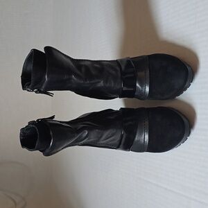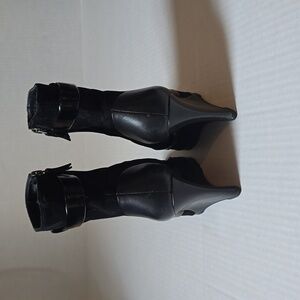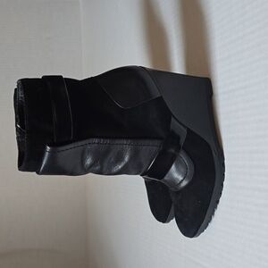 Derek Lam 10 Crosby Karli Suede Leather Wedge Bootie, Black 6.5. Leather with a rubber tread sole for traction. Almond toe with 4" covered wedge heel. Paneled vamp with strap across instep. Interior side zip for ease of dress.