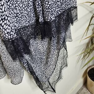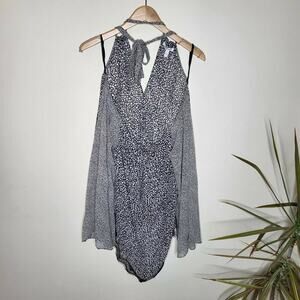 Elevate your wardrobe with this stunning Derek Lam 10 Crosby Long Sleeve Cold-Shoulder Halter-Tie Printer Blouse in a chic abstract black multi print. Made from 100% silk, this sheer blouse features delicate lace trim for a touch of elegance.