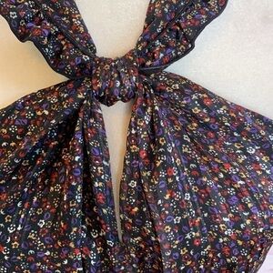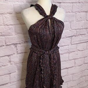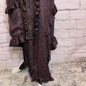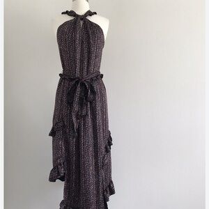 Derek Lam maxi dress. Ruffled straps and self tie belt. Uneven hem. Fully lined. Side zipper. 100% polyester. Black with tiny flowers and metallic gold threads. Womens size 6. Great used condition.