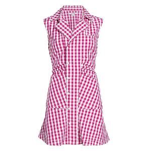 Adorable casual dress in fuchsia and white. Dress it down with some sneakers or up with high heels! Tailored with a classic fit, this sleeveless collared dress features a tapered waist with smocking at the back, front button closure and seam details that create subtle volume through the skirt.