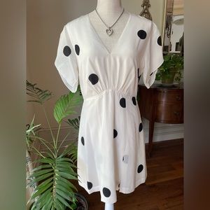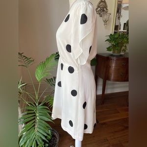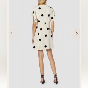 Derek Lam V-neck ruffle sleeve dress. A vintage-inspired dress silhouette. Made from a lustrous silk-jersey blend, this polka-dot style is cut for a flattering fit and has a deep V-neckline and ruffled short sleeves. Color: Ivory with Black Polka Dot. 55% Silk, 45% Viscose. Lined. NWT. See photos for details and measurements.