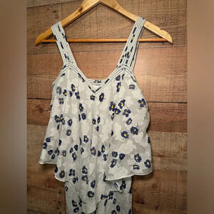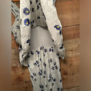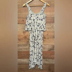 EUC! Derek Lam 10 Crosby silk tiered floral midi dress in a women's size 2. Silk crepe in a very light gray and white with navy blue floral print. Single button closure on side under arm. Fully lined.