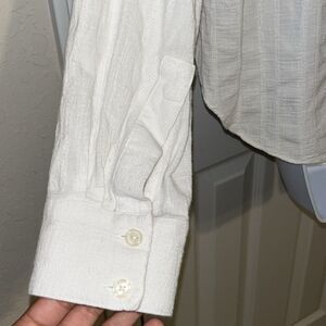 Elevate your wardrobe with this stunning Derek Lam 10 Crosby blouse. The white top features a subtle textured pattern and is adorned with 1/4 buttons for a touch of elegance. The long sleeves and round neckline make it suitable for any occasion, from casual wear to business attire.