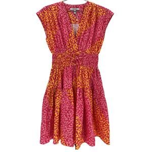 Derek Lam 10 Crosby 'Tora' Pink Cotton A-Line Dress Size 0: crossover v-neck, pleated shoulders, cap sleeves, smocked waist with three decorative bows, side slit pockets, fit-and-flare silhouette, tiered skirt, pullover style.