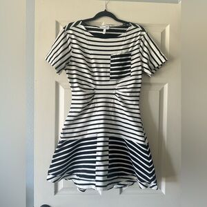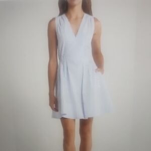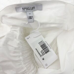 New with tags Derek Lam 10 Crosby Tora V-Neck Dress in classic white. Crafted from crisp 100% cotton poplin, this elevated designer dress features a flattering V-neckline, short sleeves, pleated bodice, gathered waist, and a full tiered A-line skirt with shirring for beautiful volume and movement. Finished with delicate bow details at the front for a feminine, romantic touch.
