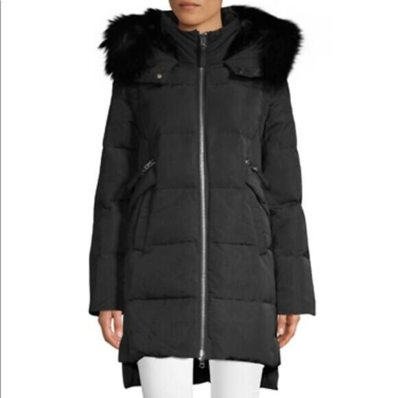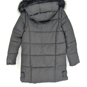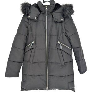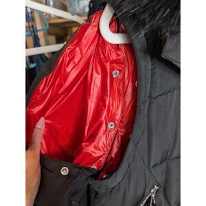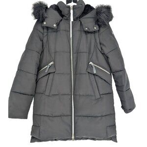 Black quilted puffer coat with snap off sleeves that converts to vest.