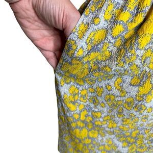 Perfect summer dress! Yellow and gray abstract floralish print, Knee length, Pockets, Pull on , A-symmetric side slit , drop waist