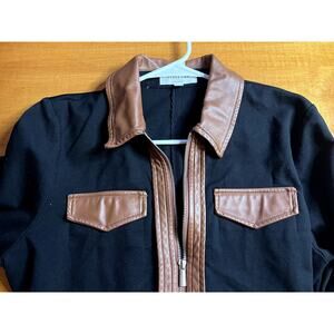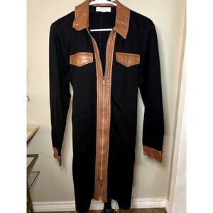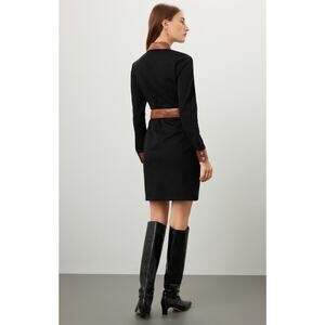 Contrasting leather trim and a zip front lend a 60s vibe to this fabulous dress by Derek Lam Collective. Pair with white knee-high boots to channel your favorite mod moment