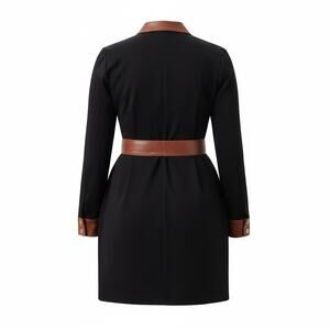Crafted from comfortable black ponte fabric, this dress features a flattering tie waist that accentuates your figure. Sheath. Long sleeves. Collar