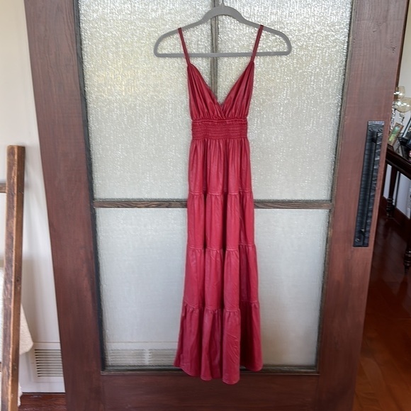 Red faux leather (50% Polyurethane, 50% Polyester). Empire. Sleeveless. V-neck. Back zipper closure. 50.5" from shoulder to hemline. Imported.