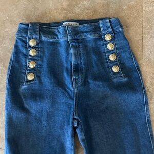 Our cult-favorite flared trouser with gold-tone sailor button details along the hips is updated this season in a premium comfort stretch Italian denim with a stone-wash finish. Zip fly with button closure, flat front, tonal belt loops and stitching.