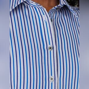 Chic striped dress by Derek Lam. Features button-down front. Long sleeves with a classic collar. Perfect for casual outings.