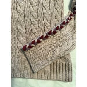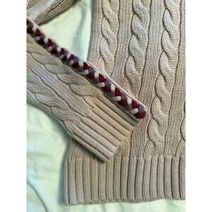 Stay cozy and effortlessly chic in this luxe Derek Lam Collective cable knit sweater. Crafted in a soft blush pink hue, this chunky knit features standout braided trim in burgundy, lavender, and taupe running along both sleeves. Perfect for elevating your fall or winter wardrobe with texture and sophistication.