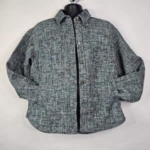 New, without tag Derek Lam women's button-up textured shacket. Two breast pockets, two side pockets, and lined. Multicolor light teal, rust, black, white, and cyan blue