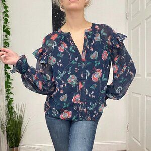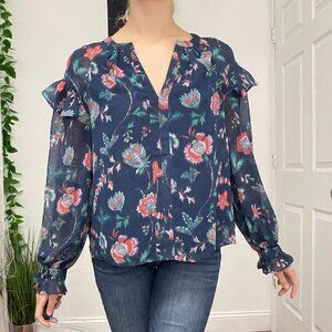 Derek Lam Floral Print Ruffle Trim V-Neck Top Blouse Size 2 Blue