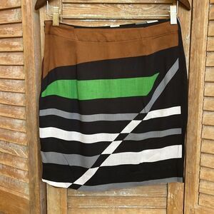 Black, white, green, and brown striped geometric skirt.