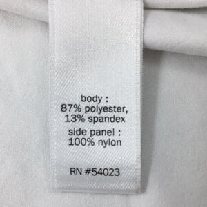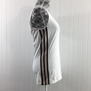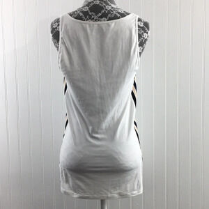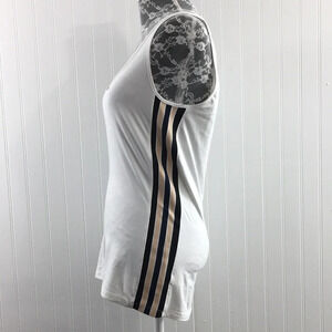 Derek Lam IOC Athleta Limited Dry Fit Tank White. With white and tan stripe side panel. 87% Polyester and 13% Spandex. Side Panel 100% Nylon. Women's size Medium. Pre-owned. Small pin size hole left strap.