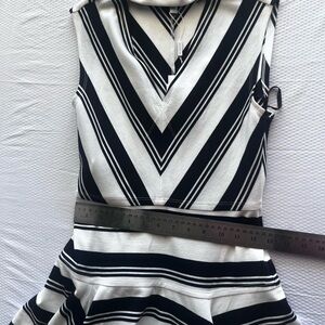 Elegant midi dress with striking black and white stripes. Features a V-neck and a flowing skirt.