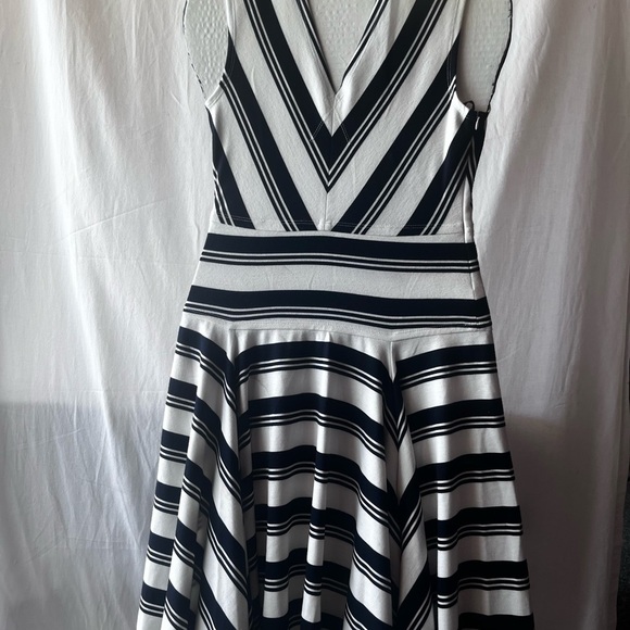 Elegant midi dress with striking black and white stripes. Features a V-neck and a flowing skirt.