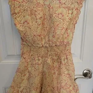 Pink floral cotton (100% Cotton). Hourglass. V-neck. Sleeveless. Pull-on. 37.5" from shoulder to hemline. Imported.